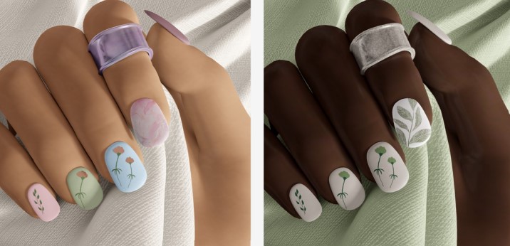 The ring finger is typically what people choose to be the ‘standout nail,’ but go for whatever you like best! Some of our favorite nail design additions are flowers, leaves, constellations, and fruits. For another cool nail inspiration, consider going abstract: let your creativity flow in any direction with geometric shapes and funky lines.
