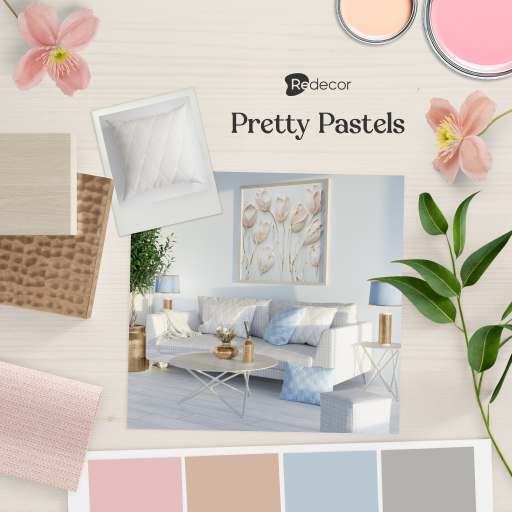 With a color palette filled with pink, peach, mint, lavender, baby blue, and a touch of grey, this design style is all about creating a space that feels light, airy, and full of positive energy. It’s romantic yet fresh, heavenly but mature—a perfect blend of optimism and sophistication. Keep reading to discover 5 tips from the Redecor Art Team to help you master the Pretty Pastels design style this Season!